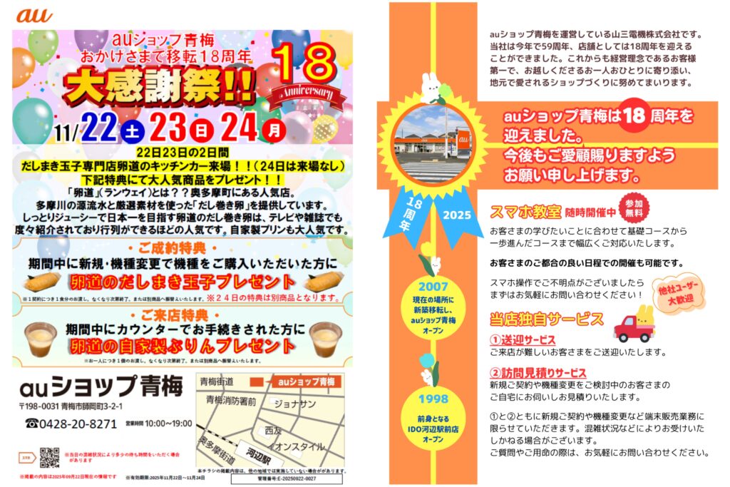auショップ青梅は地元の皆様に支えられ、令和7年11月に18周年を迎えることができました。11月22日・23日・24日の3日間には大感謝祭を開催し、約130名のお客様にご来店いただきました。心より御礼申し上げます。