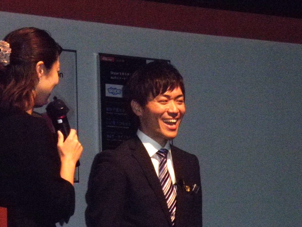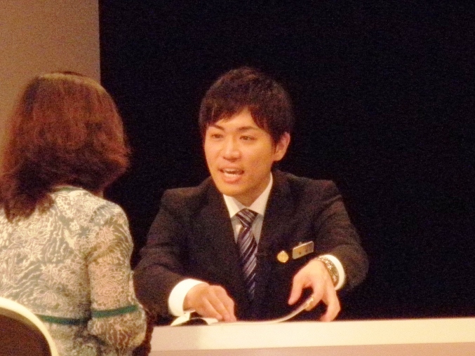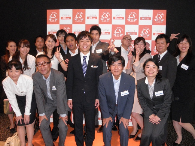 今年の大会は、各出場者や所属店の紹介、応援もそこそこにどんどんと進行して行きました。だから、倉島さんの出番はあっという間にやってきたカンジでした。見ている方がそう感じたのだから、当の本人はもっと緊迫感を感じていたかも…。プロの俳優さん演じるお客様との店内でのひとコマを演じるデモンストレーション。演技がいよいよ始まりました。 倉島さんのステージでの笑顔は本当に素晴らしかったです。お客様をお迎えするところから、その接客スタイルはカンペキでした。何度も何度も、練習を重ねた成果がそこにはありました。10分間の演技を終えた倉島さんの笑顔。その時心の中にあったものは…それは本人でなければ分からないことです。でも、大勢のauスタッフの中から選ばれ、この緊張感あふれる大きな舞台で『CSファイナリスト』は演じ切りました。本当にお疲れさまでした。