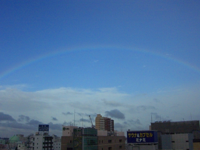 いつもは建物の間に一部分だけ見えることが多いんですけど、今日は建物の上にきれいに弧を描いてるんです。ちょっと感動してしまいました・・・。