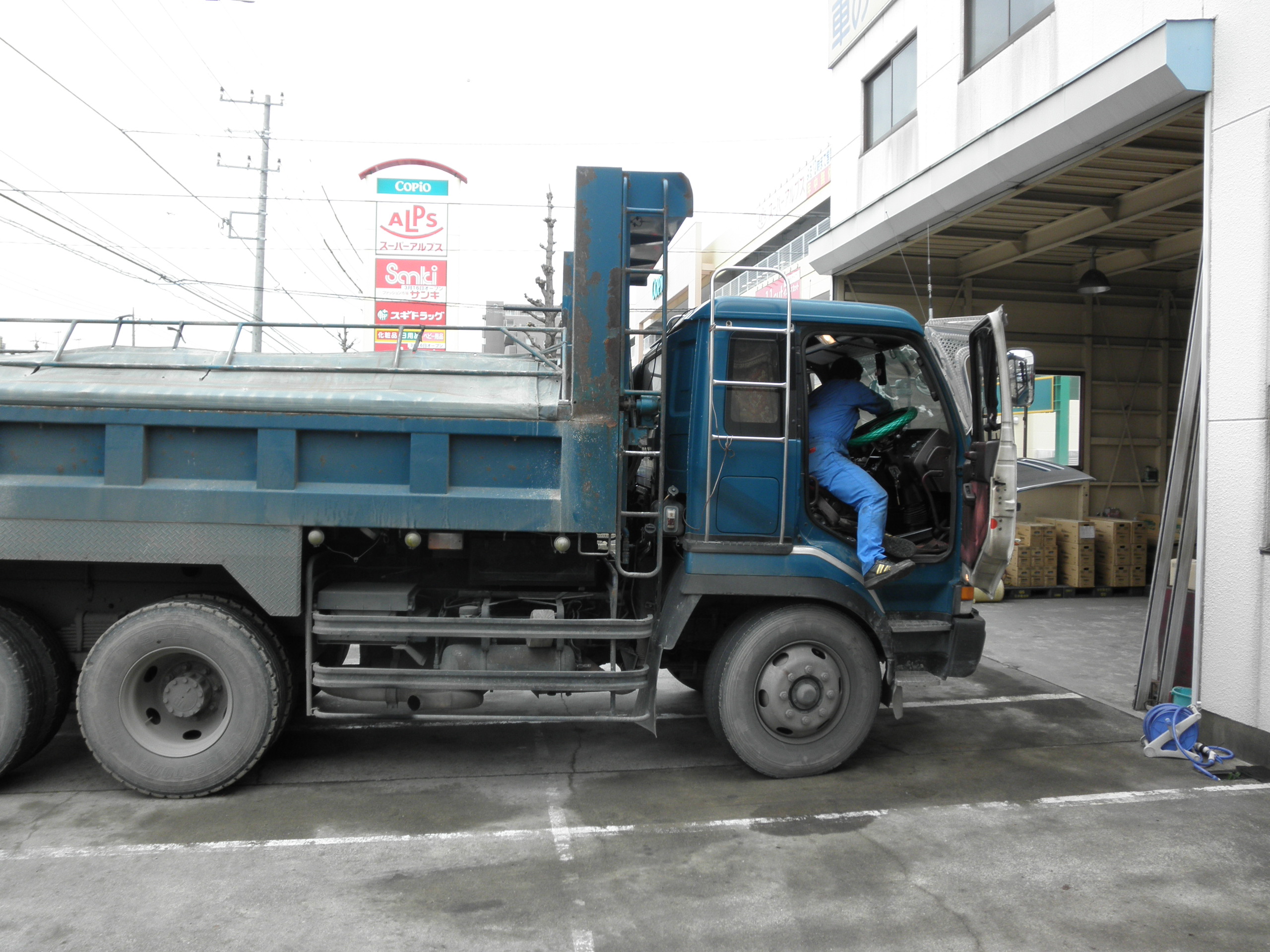 どんなトラックが入ってくるのかな?なんて思っていたら、しばらくするととっても大きなトラックが入って来ました!う〜ん、ホントに大きい・・・。運転席で作業を始めたNさんが小さく見えます。
