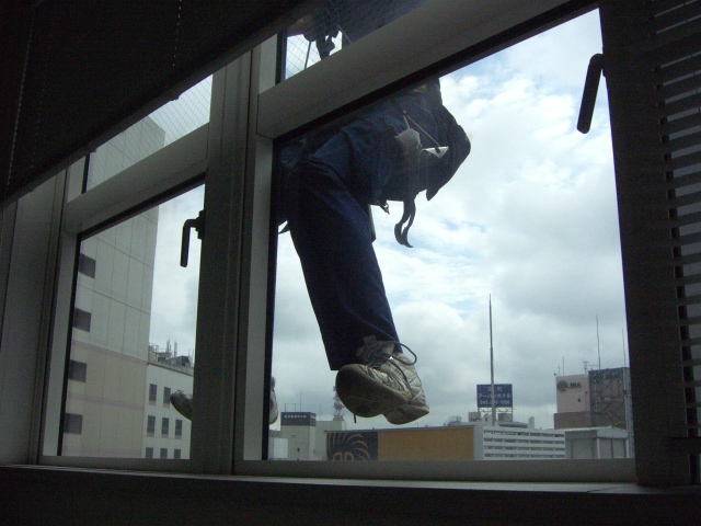 もちろん、下からも拝見。・・・コワイです!!高所恐怖症の私は見てるだけで足がすくんじゃいます。あんな不安定な状態で窓を拭いていくなんてすごいです。