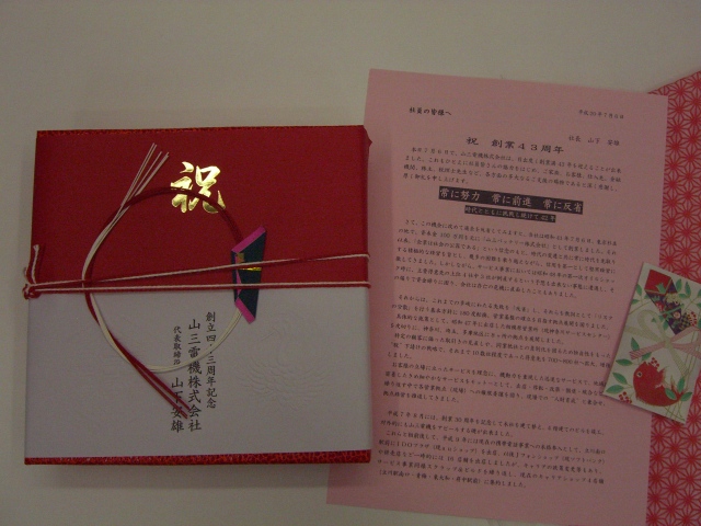 さて、この“できたてほかほか”のお赤飯と同じく毎年恒例なのが、「社長からのメッセージ」です。A4サイズの用紙に2枚、山三電機の歴史を振り返りつつ、今後への意気込みが語られています。メッセージにあるように、『攻めと守り』の姿勢で、次の44周年へ向けて山三電機は走り続けます!(S) |